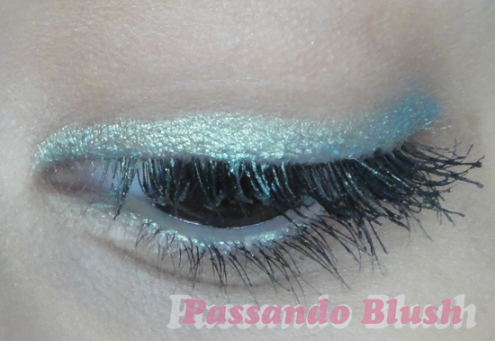 44 Golden Grey Session. Ele é um verde bem clarinho com leve cintilância. Esse lápis é conhecido por sua maciez e por durar muito nos olhos. Ele é macio mesmo e é ótimo para fazer um esfumado e, por ser a prova dágua, ele dura muito nos olhos. O único ponto ruim dessa cor é que ela não apareceu na linha dágua, como mostra a foto abaixo: