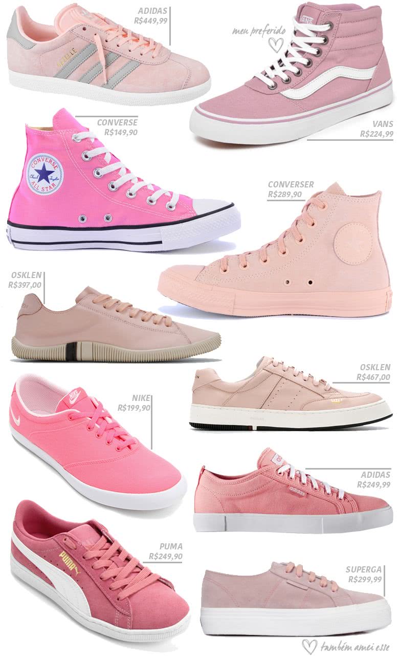 Na verdade o tênis rosa que eu mais queria era um Converse num tom de rosa super clarinho mas eu nunca vi pra vender. Nessa saga, pesquisei vários modelos e encontrei muitos lindo, olhem só: