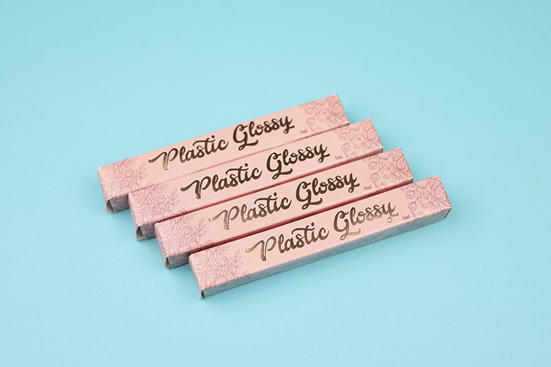 A embalagem dos Plastic Glossy da Linha Bruna Tavares tá a coisa mais linda! A embalagem de papel é cor de rosa com rosé gold e a embalagem plástica é com azul marinho e detalhes rosé gold! Incrível! A Bru arrasou demais!