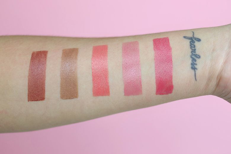 Na ordem: Caramelo Couro, Champanhe Renda, Coral Cetim, Rosado Tule e Pink Chiffon.