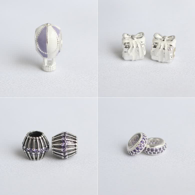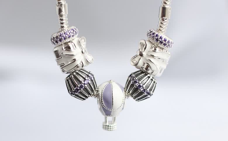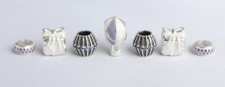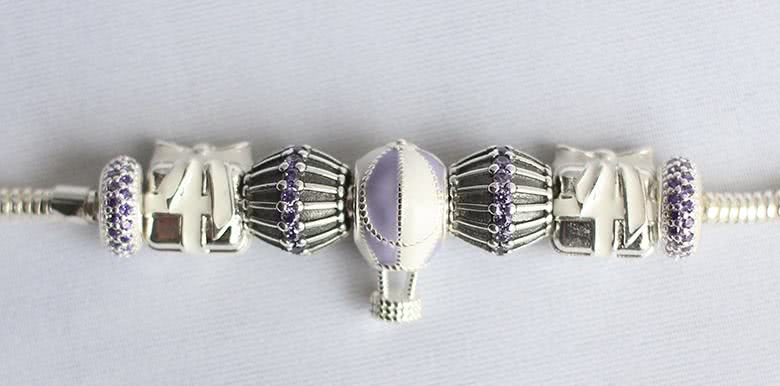 Depois de olhar todos os berloques do site, o que eu mais me apaixonei foi nesse modelo de balão, que inclusive tem em diversas cores disponíveis. Como eu já tenho uma pulseira com significado variados, achei que seria legal montar uma com os tons e berloques que eu achava legal. O balão em lilás e branco é ainda mais apaixonante ao vivo. Escolhi ele como peça principal da minha pulseira e fui em busca de berloques com tons lilás que combinassem.