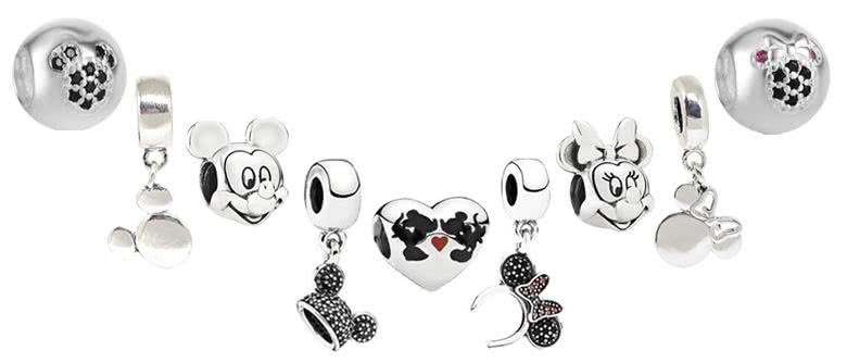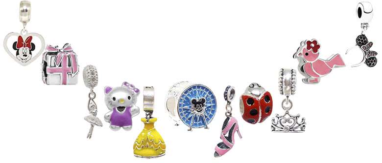 Essa é uma das minhas preferidas porque escolhi o tema Mickey e Minnie. Eram tantas opções que foi muito difícil escolher! Também é possível escolher o tema Disney porque no site tem vários berloques de personagens. Também misturei berloques menores e estilo pingente. Optei por não colocar berloques esmaltados para deixar tudo mais clean.