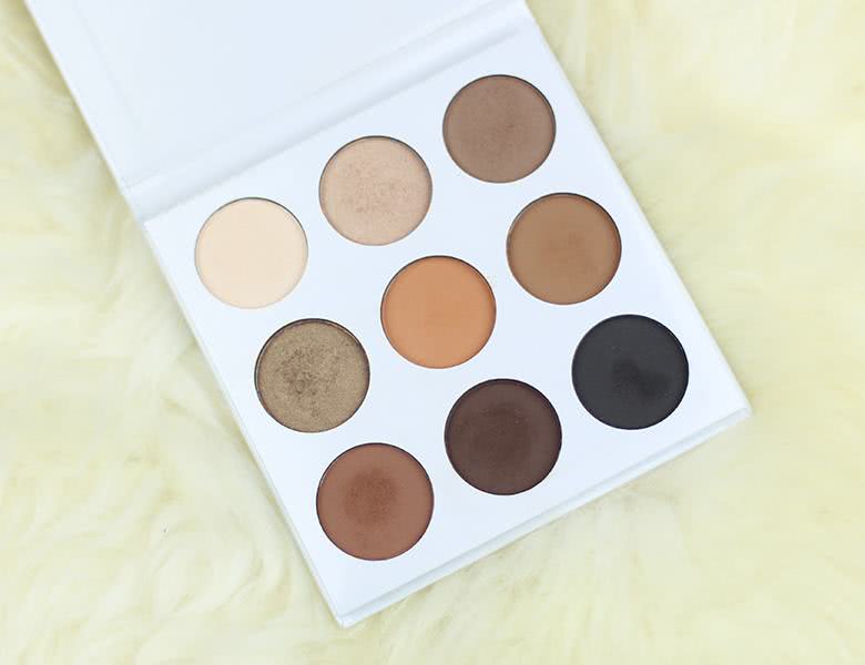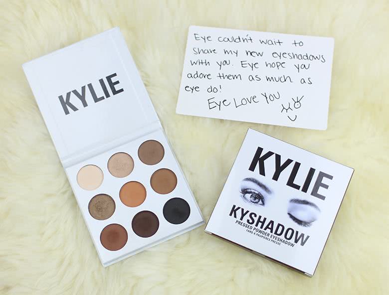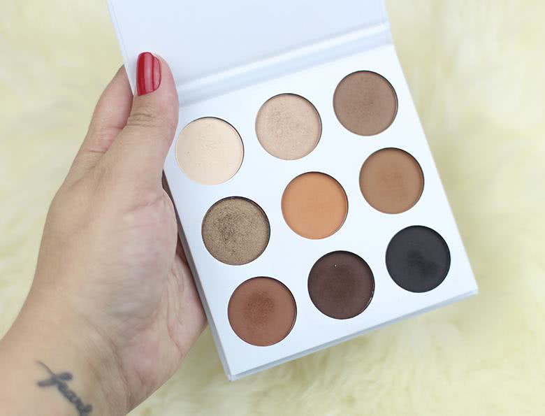 A Kyshadow vem numa embalagem de papel resistente e uma cartinha linda com a letra da Kylie. As sombras são grandes, do tamanho das sombras avulsas da MAC. São 9 cores neutras em tons de bronze, sendo duas acetinadas com brilho e 7 opacas.
