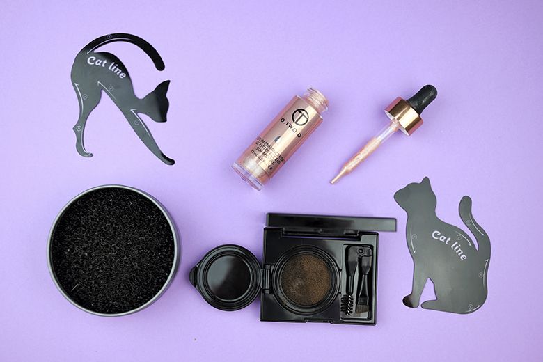 Tem cílios de LED, molde de gatinho para fazer delineado, iluminador diferentão, limpa pincéis, cushion para sobrancelhas… Um montão de produtos diferentes!
