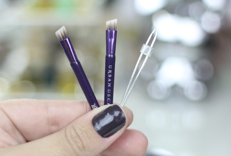 Na parte debaixo também tem um espelho na tampa e vem com três acessórios: dois pincéis chanfrados (que são ótimos e super firmes) e uma mini pinça. Quem nunca foi corrigir a sobrancelha e viu um pelo atrapalhando? Rs