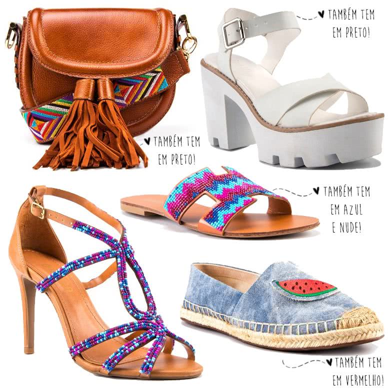 Vocês sabem que eu não resisto uma bolsa, né? Pirei nesse modelo caramelo que tem um toque étnico e super colorido. Além de estar super em alta modelos neutros com alças super decoradas. A sandália branca tratorada é quase um item obrigatório (e eu ainda não tenho  meu!) porque é confortável e trás te volta os anos 90 (melhores anos!). Verão tem tudo a ver com miçangas, vocês concordam? Amei a idéia na sandália de salto (meu item preferido de todos!) e na rasteirinha. Eu amo alpargatas e pirei nesse modelo com jeans e melancia. Achei muito fofo!