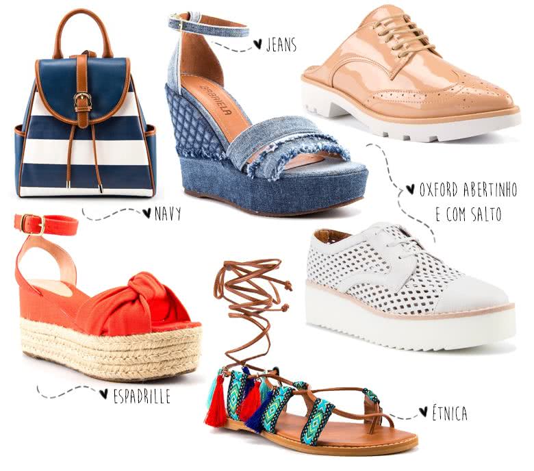 Como foi muito difícil escolher só 5 itens que eu mais amei, fiz uma seleção de algumas tendências que estão em alta. A mochila voltou com tudo né? Amei esse estilo navy! Assim como aquela alpargata jeans, olha esse salto que maravilhoso! Achei tão moderno! Imagina com um shortinho branco que lindo? O oxford ganhou nosso coração e agora pro verão tem modelinho abertinho e também branco tratorado. Essa espadrille flatform tinha que estar nos meus preferidos! Eu amei a cor e o salto flatform deve ser muito confortável! E essa gladiadora com toque étnico? Babei!