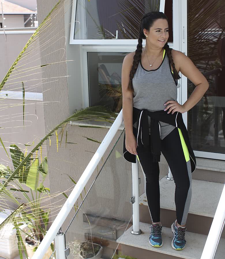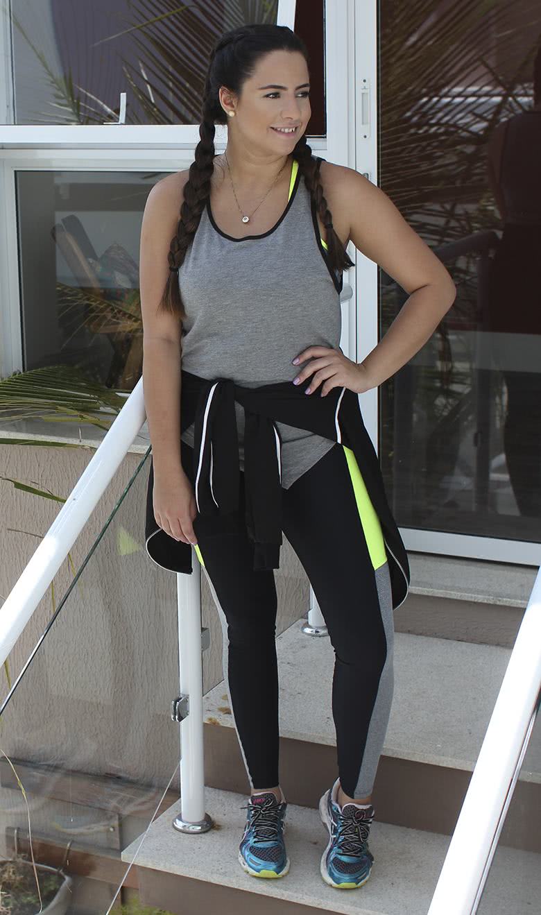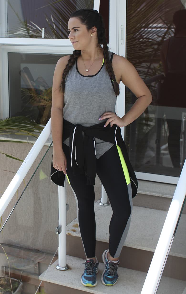 Apesar de amar azul marinho, eu acabo usando mais roupas fitness pretas. E esse conjunto combina o cinza, branco e verde, o que deixou bem diferente. Assim como o outro conjunto, as peças são fresquinhas e leves, o que gostei muito. Combinei também com uma blusinha cinza, mas essa tem um corte assimétrico na frente.