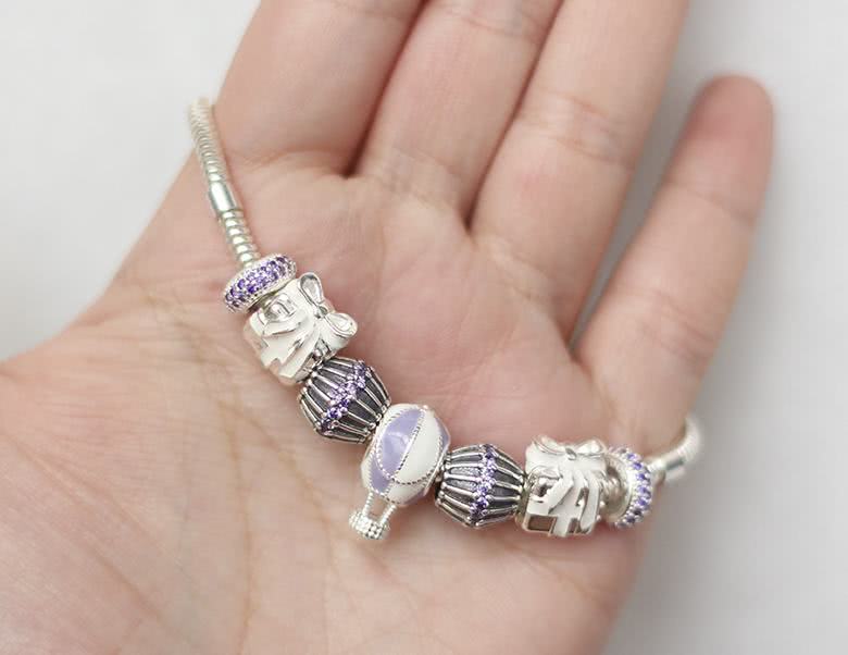 Depois de olhar todos os berloques do site, o que eu mais me apaixonei foi nesse modelo de balão, que inclusive tem em diversas cores disponíveis. Como eu já tenho uma pulseira com significado variados, achei que seria legal montar uma com os tons e berloques que eu achava legal. O balão em lilás e branco é ainda mais apaixonante ao vivo. Escolhi ele como peça principal da minha pulseira e fui em busca de berloques com tons lilás que combinassem.