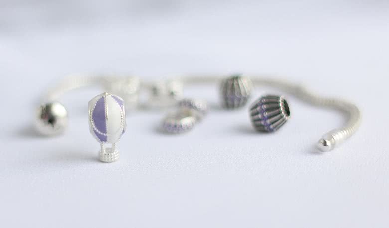 Depois de olhar todos os berloques do site, o que eu mais me apaixonei foi nesse modelo de balão, que inclusive tem em diversas cores disponíveis. Como eu já tenho uma pulseira com significado variados, achei que seria legal montar uma com os tons e berloques que eu achava legal. O balão em lilás e branco é ainda mais apaixonante ao vivo. Escolhi ele como peça principal da minha pulseira e fui em busca de berloques com tons lilás que combinassem.