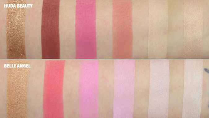 As cores variam bastante entre si também! Enquanto as cores da Huda são mais quentes, escuras e vibrantes as da Belle Angel são mais claras e frias.