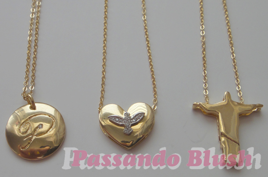 Tenho três colares para mostrar pra vocês, todos são dourados, com pingente trabalhados e o mais legal é que a corrente vem com ajuste de tamanho. Confiram: