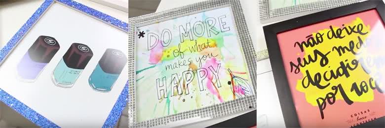 Se você ama quadros mas não quer furar a parede, como eu disse, a solução são fitas de fixação forte que seguram quadros. Elas são super prática e fáceis de encontrar. Ou então como sugestão a primeira opção que só colou as ilustrações usando fita adesiva colorida, achei bem original. Nesse post eu ensinei como fazer quadrinhos gastando pouco, não deixe de conferir.