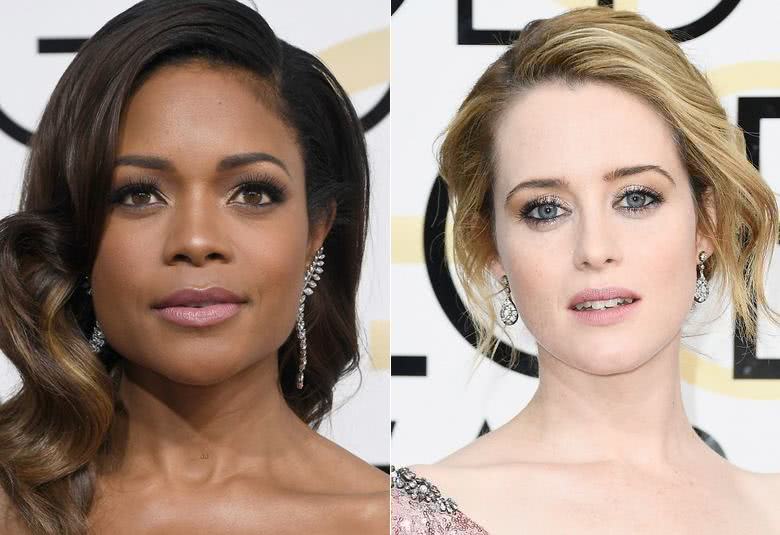 A Claire Foy também optou por um batom rosa claro que, aliás, é quase o tom da Naomie. O que me chamou atenção nela foi o lápis preto em toda volta dos olhos. Eu não gosto, mas sei que muita gente usa make assim!
