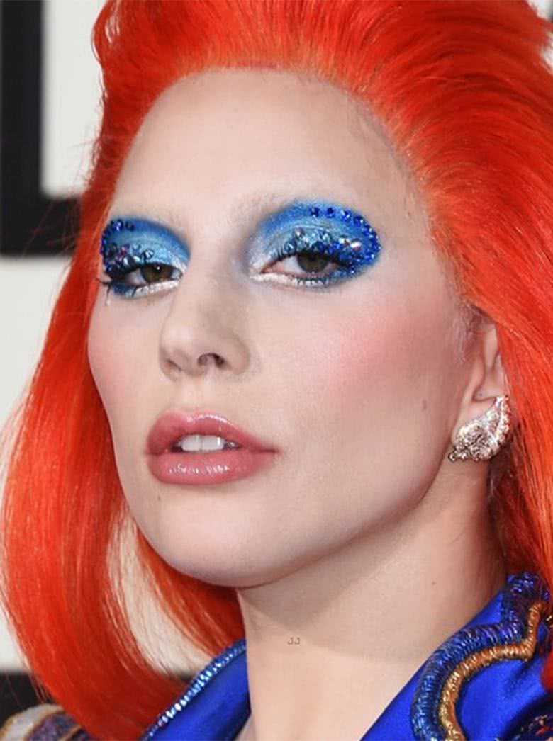 Lady Gaga sendo ela mesma com essa make, né? Acho que combina demais com ela e achei bem ousado o vermelho (ou seria um rosa forte?) com o dourado. Eu não usaria, mas temos que confessar que ela pode, né?