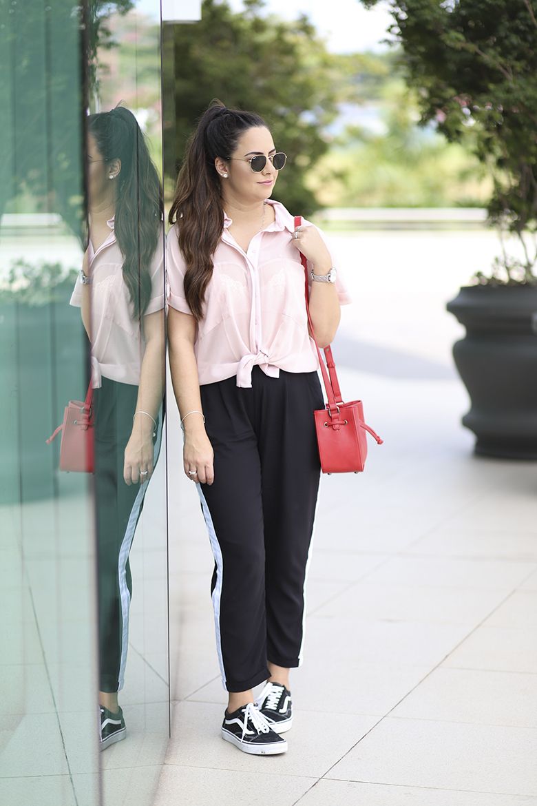 Essa calça eu comprei influenciada por uma amiga! Fomos ao shopping e ela comentou o quão confortável e estiloso era esse modelo! Me ganhou! Trouxe pra casa com a ideia de usá-la com uma t-shirt, minha peça de roupa preferida e a minha cara, mas aí quando vi essa camisa transparente da Amaro, pensei que o contraste de uma peça mais esportiva com a camisa mais chiquezinha ficaria legal! E não é que amei?