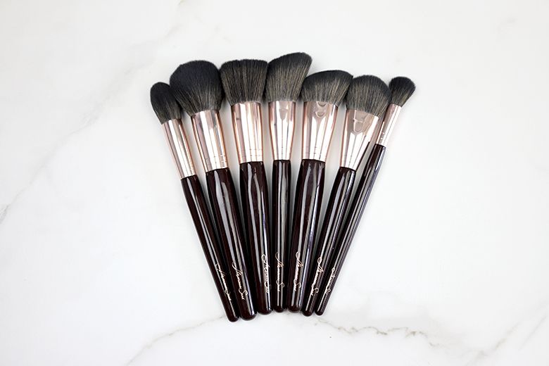 Os pincéis estão num tom de marrom bem escuro, com detalhes rosé gold na parte do metal, na assinatura da Mariana e identificação de cada pincel.