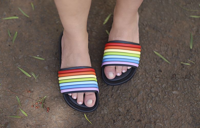 Uma coisa que eu tenho prezado muito nos últimos tempos é conforto, especialmente nos pés. E um slide é perfeito para isso, né? Estou apaixonada pela nova Melissa Beach Slide que, além de confortável, é linda. A minha é na versão 3D Rainbow que tem as cores do arco íris em relevo no fundo preto.