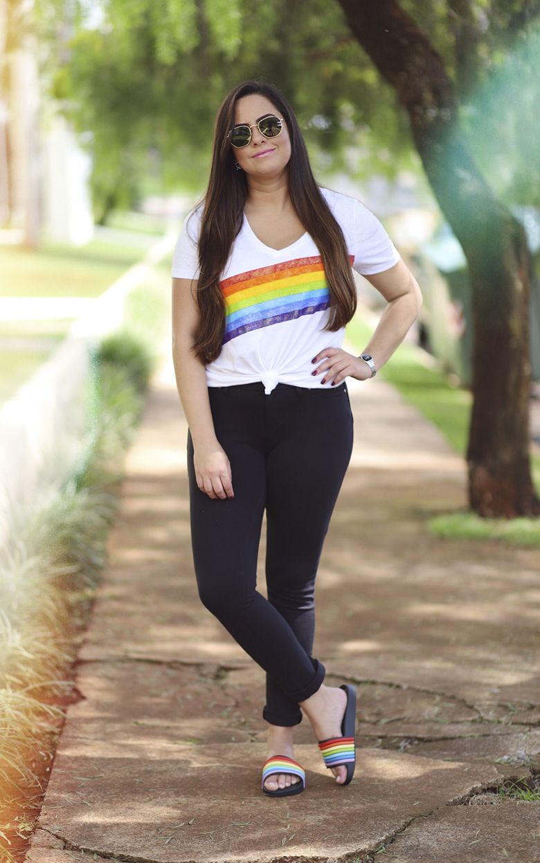 Por fim, porque não usar slide com calça? Eu uso sempre! Amo esse “contraste“. Para deixar mais descolado, dobrei a barra da calça (coisa que eu amo fazer!) e também dei um nózinho na tshirt para dar um charme. A tshirt foi especialmente escolhida para brincar com a estampa do chinelo. Aliás, eu que fiz essa camiseta!