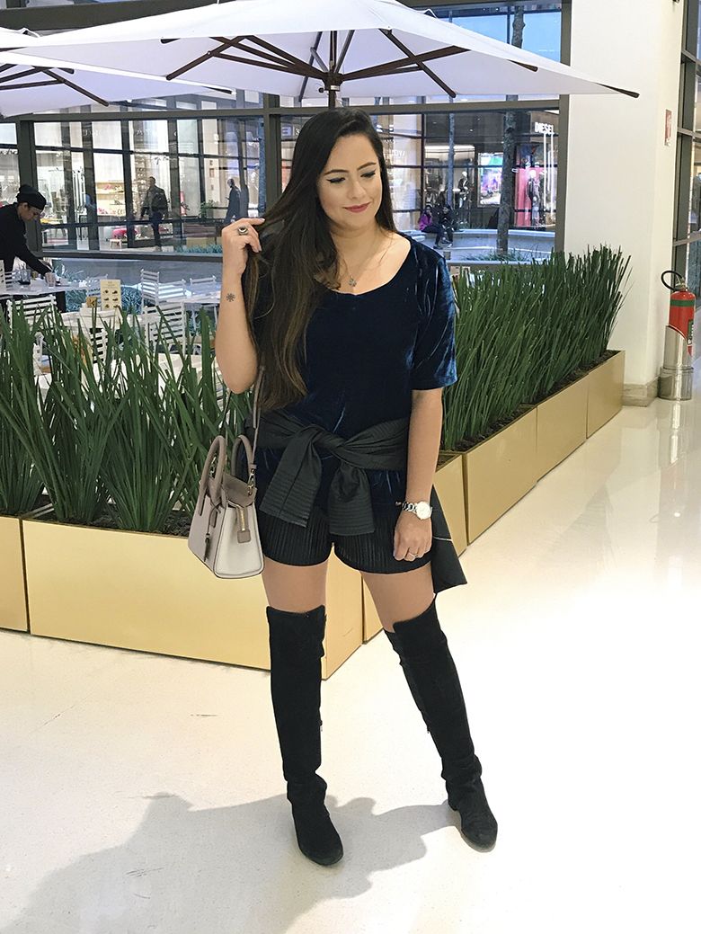 Essa blusa azul de veludo é maravilhosa! Tenho usado muito ela. Achei que a cor combinou muito comigo. E o shortinho é plissado preto, uma graça. Quanto a bota nem preciso falar, né? Ela já anda sozinha a uns 3 invernos! Haha Amo demais over the knee!