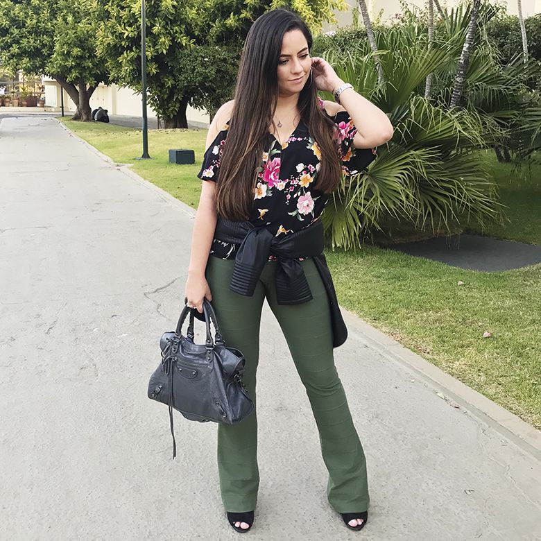 Uma das peças de roupas que eu mais gosto e que eu acho que mais valoriza meu corpo é a calça flare. Esse modelo em especial é aquele bandage que veste muuuuito bem! Ele é um tecido mais grossinho que não marca nada, a calça não laceia e modela super o corpo. Eu compro as minhas na Annahi, comentei aqui em cima da loja, e o preço é mara! Já quero uma de cada cor! Essa verde militar é linda, né? Combinei com uma blusinha florida e amarrei uma jaqueta de couro na cintura porque estava mais frio nesse dia. Aliás, essa jaqueta andou sozinha nos dias mais frios! Agarrei amor e não larguei mais!