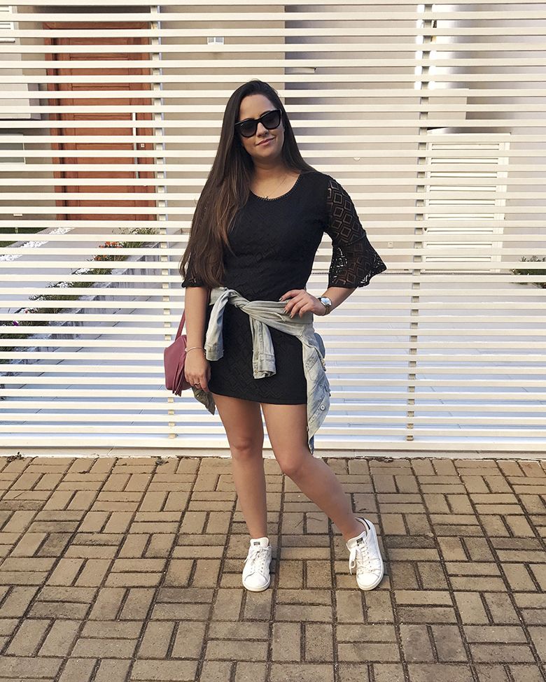 Vocês sabem que eu não sou uma pessoa que usa roupas justas, né? Especialmente vestidos. Quando ganhei esse fiquei pensando “como vou usar?” e arrisquei ele combinando com uma jaqueta jeans e um tênis no pé. Amei tanto esse estilo que já quero mais vestidos arrumadinhos para usar com tênis.