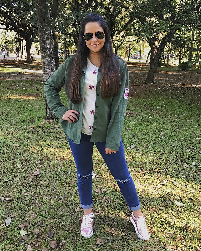 Não sei dizer se isso é uma parka, uma jaqueta, uma camisa… Mas usei bastante também! Adorei que ela é bem soltinha e mais comprida. Combinei com meu jeans preferido e uma tshirt que eu amo. O tênis já apareceu aqui também, mostrei ele quando comprei, se lembram? Esse dia fui a SP numa feira de alimentos naturais.