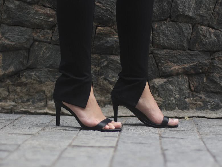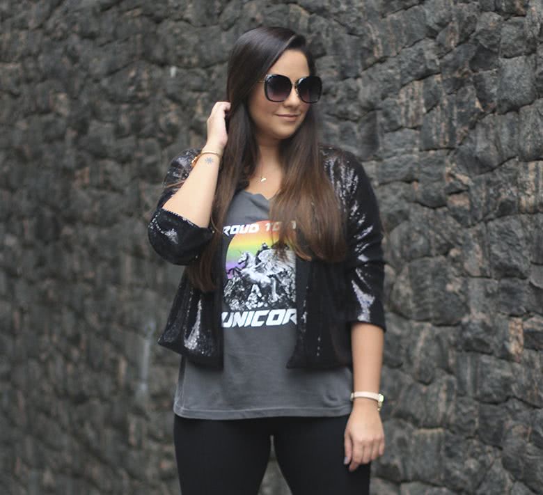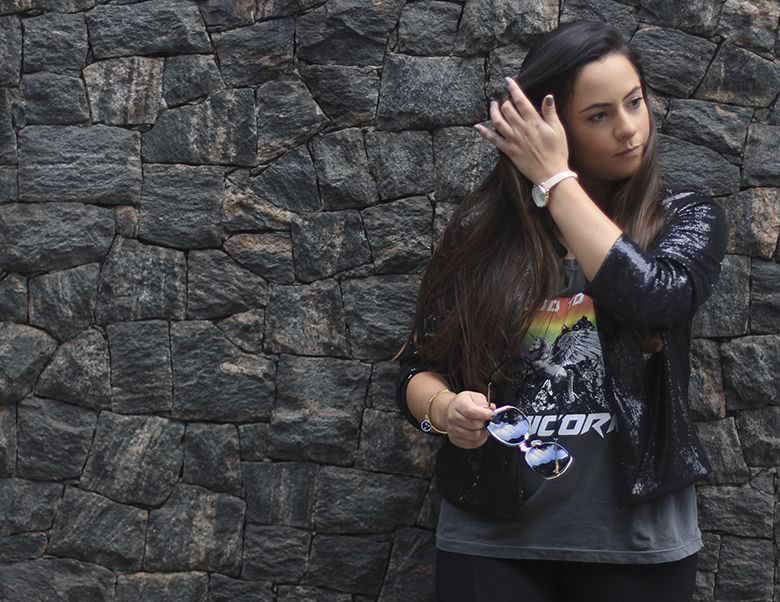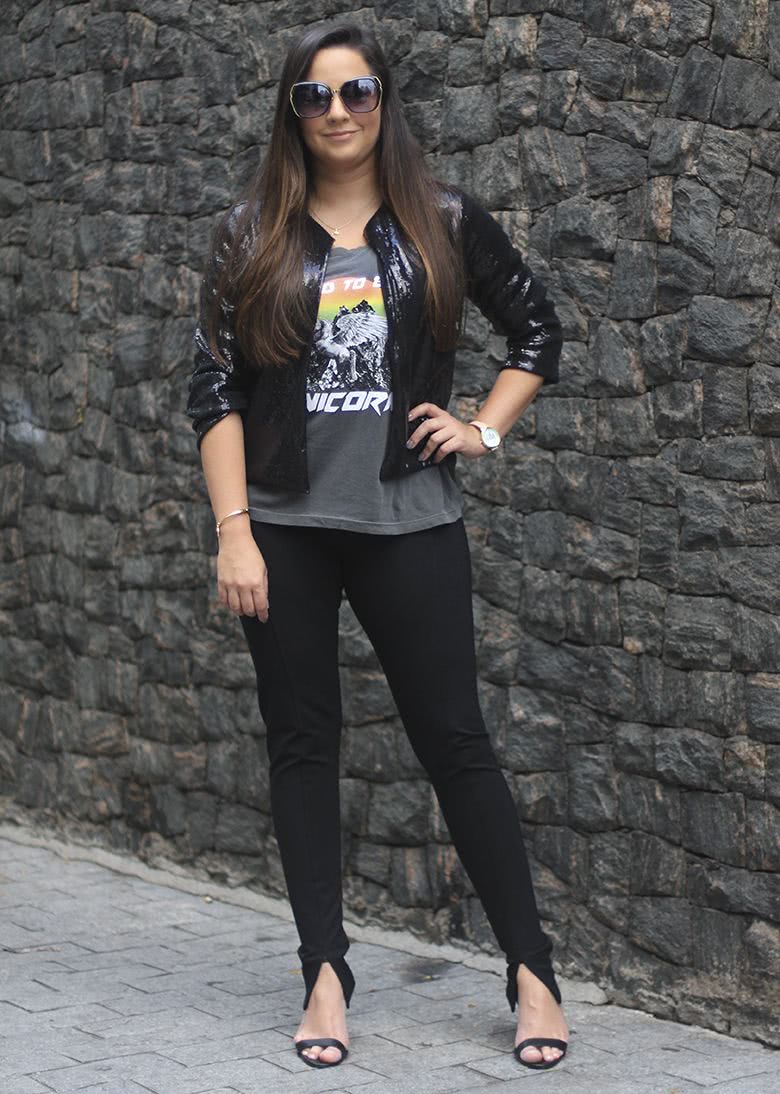 Arrisquei e combinei a tshirt, que é super descolada e casual, com um casaco de paetês e um salto fino. Também ficaria super legal com um sapato mais pesado tipo bota. A calça foi amor demais porque ela é super confortável, modela o corpo e tem esse detalhe da fenda embaixo.