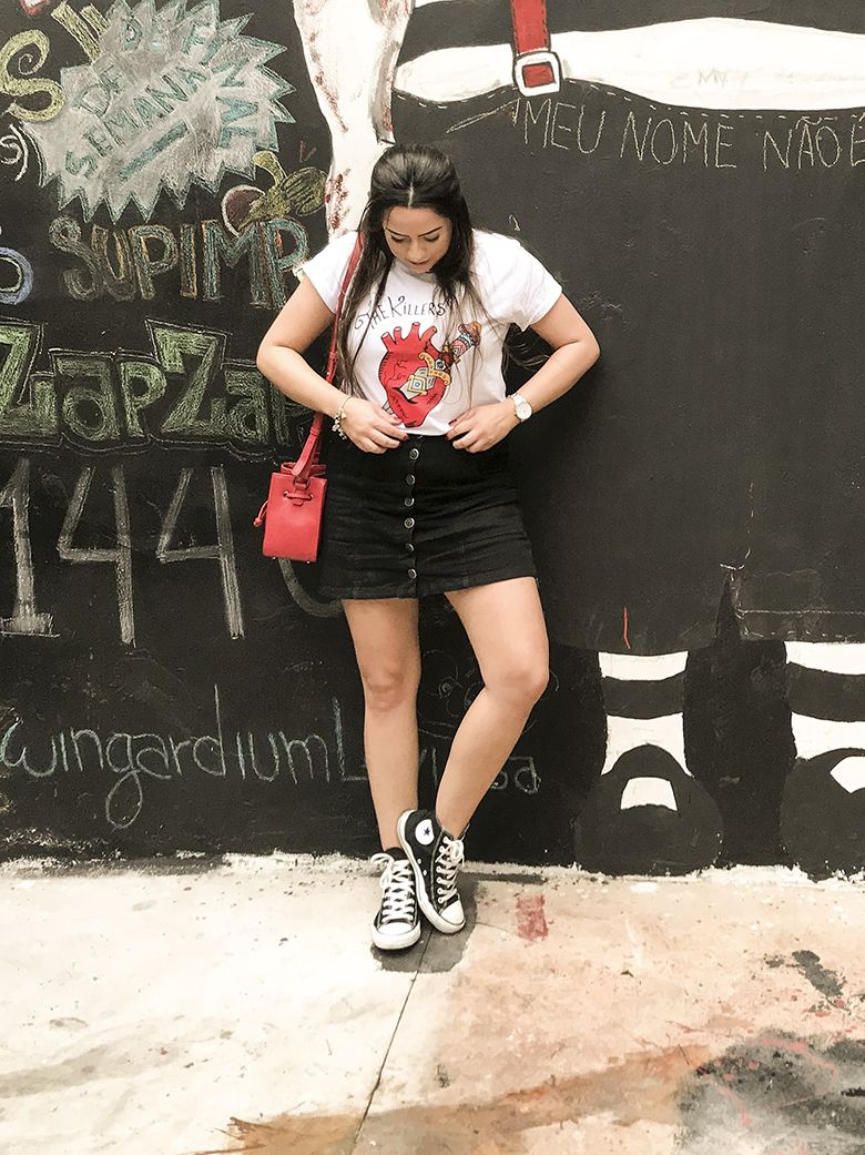 Camiseta: Universo Loja – Saia: Youcom – Tênis: Converse – Bolsa: Amaro
