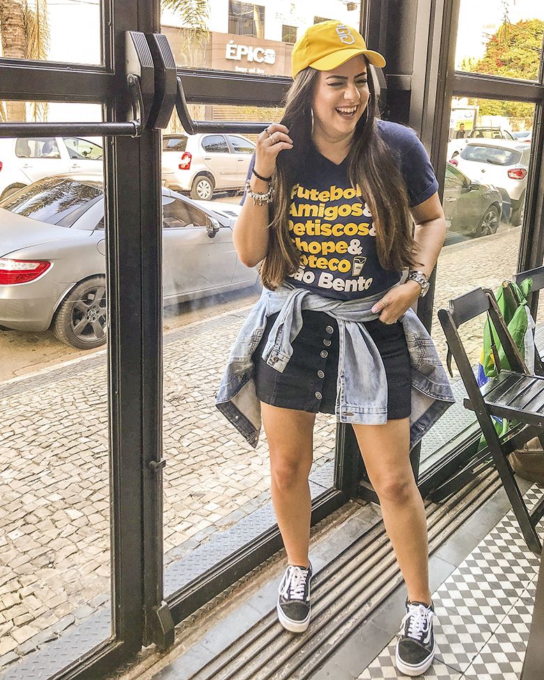Fui assistir ao primeiro jogo do Brasil na Copa no Boteco São Bento e usei a camiseta do bar que, por sinal, era super moderninha! Amarrei uma jaqueta jeans na cintura, usei um boné amarelo para combinar com a camiseta e, nos pés, meu amado Vans!