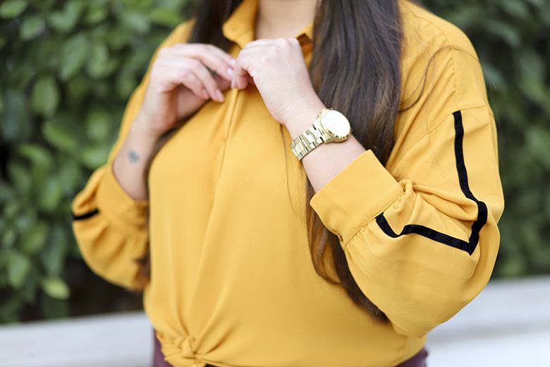 O tom mostarda vem com tudo neste inverno, podem apostar sem medo! Minha escolha foi essa camisa com mangas mais larguinhas e detalhe de fitinha de veludo. Amei tanto!!