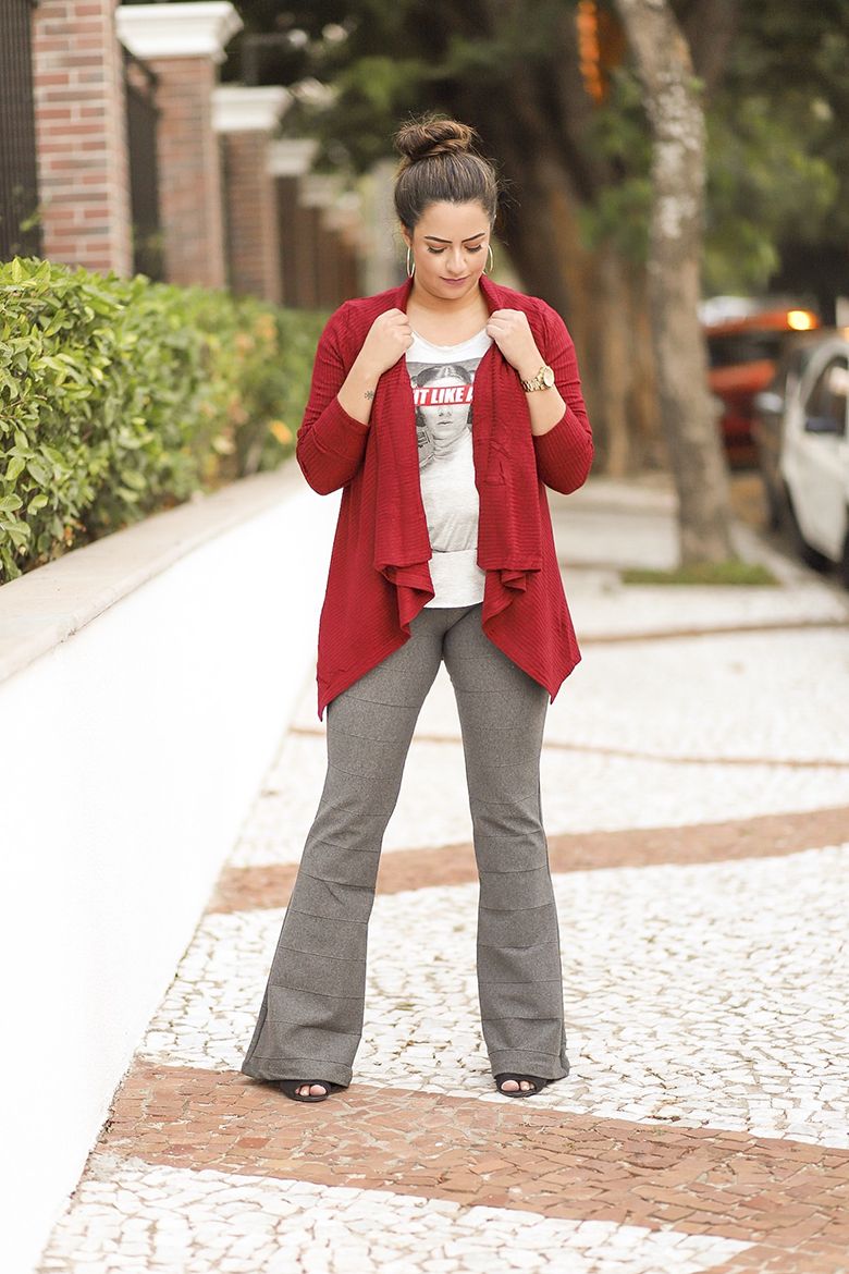 Combinei a camiseta cinza mescla com uma calça flare de bandagem também cinza, mas em um tom diferente.
