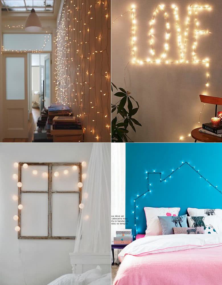 E quem não ama pisca pisca de Natal? Eles são um charme tão especial que dá pra ser usado o ano inteiro. Hoje em dia encontramos em diversas cores e formatos e você pode decorar sua parede com elas. Minha sugestão é fazer como se fosse uma cortina como mostra na primeira foto ou até montar palavras e desenhos com as luzinhas. E ai pra prender, basta usar fita adesiva de fixação forte. Amei essa foto de uma moldura de janela falsa com pisca pisca de bolinhas grandes, achei que ficou super criativo. No meu escritório eu coloquei na cortina, se lembram?