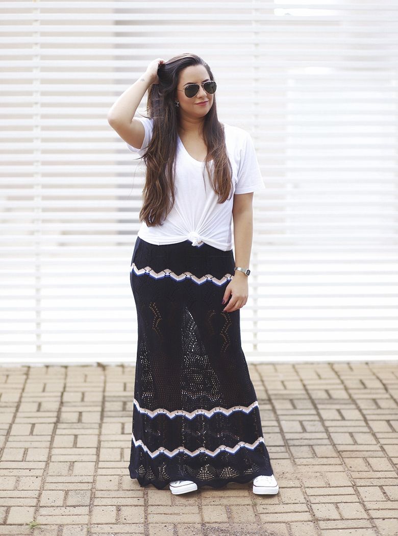 Ela tem uma modelagem muito boa e é de um tricot mais pesado e grosso. Mas ela é toda furadinha, eu acabei colocando um shortinho preto justinho por baixo. Pode ser até com uma hot pants que fica lindo! Pra combinar o look, optei por uma tshirt básica branca com um nózinho (estou amando usar assim!) e tênis branquinho. Eu amo saia longa com tênis, acho que fica super descolado.