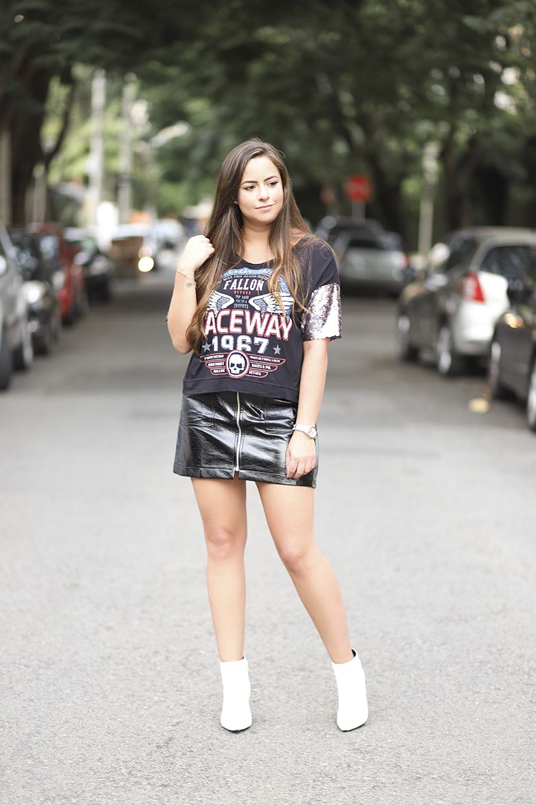 Camiseta: Camarote Brahma – Saia: Carmella – Blazer: Riachuelo – Bota: Dumond