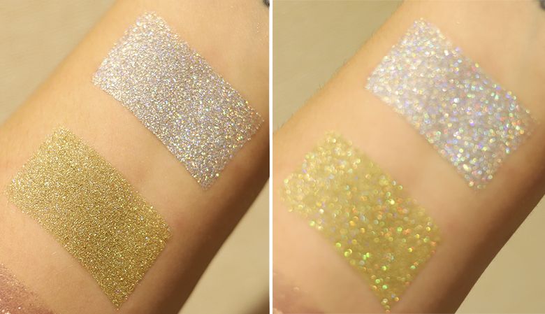Já as sombras de glitter são super fininhas e não ficam tão brilhantes quanto eu imaginava! Apenas no sol ou em luzes amareladas que a gente consegue ver melhor as partículas de brilho!